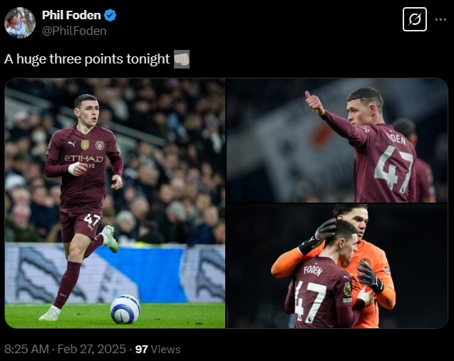 体育快讯2月27日讯 今天凌晨,曼城在英超1-0战胜热刺,福登赛后在推特晒出自己的赛场照片,庆祝胜利。